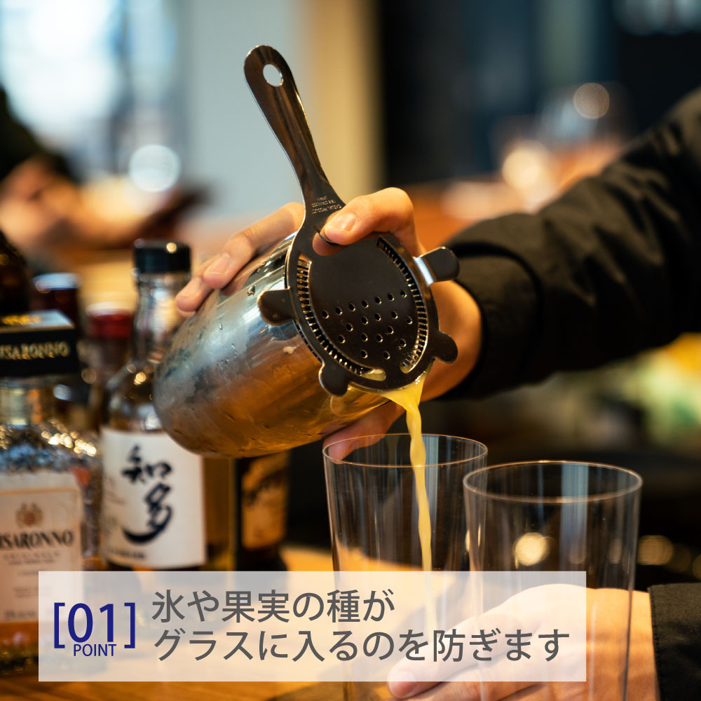 マティーニなどのカクテルを作る際に欠かせないストレーナー。プロも使える仕様のスタンダードストレーナーです。使う時は、サイズの合うミキシンググラス、ステア(かき混ぜる)ができるバースプーンと一緒に使います。ミキシンググラスにストレーナーのスプリング部分をセットし上からステアしたカクテルを注ぐと、氷や余分な果物の果肉などを漉しとることが出来ます。お店のような本格的なカクテルを、お家でも手軽に楽しみたいという方におすすめです。プロバーテンダーのような雰囲気を演出してくれるので、普段のカクテルライフもより盛り上がります。