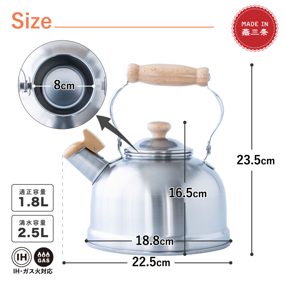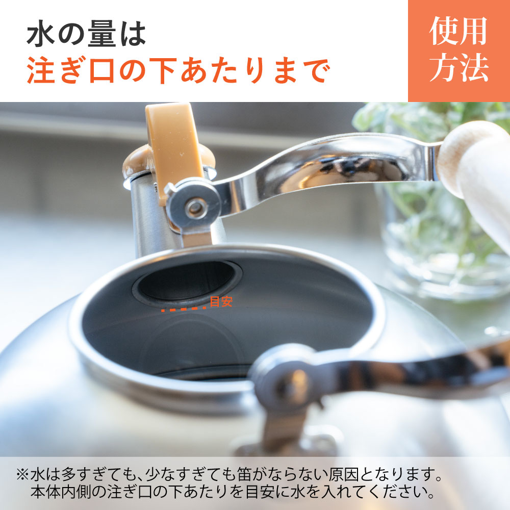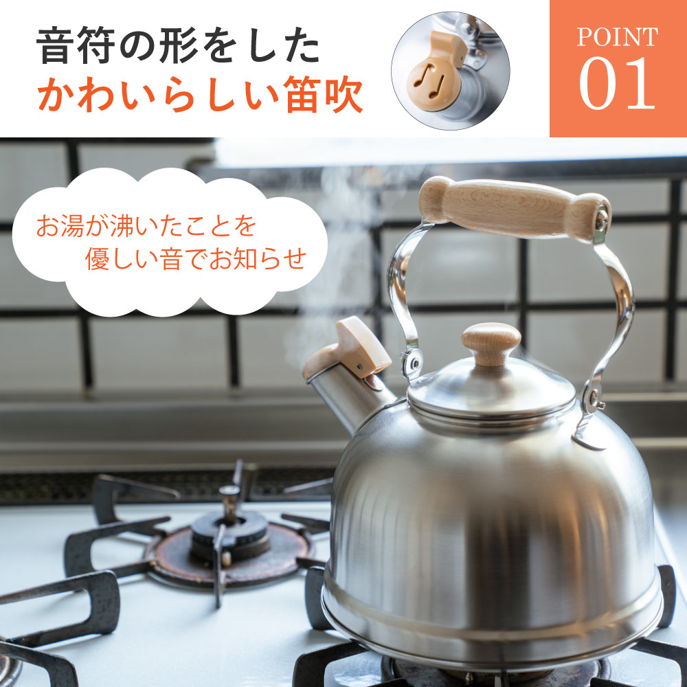 お湯が沸いたら耳に優しいハーモニカの音色で優しく教えてくれる笛吹ケトルです。毎日使うものだからこそ「可愛らしくシンプル」長く使っても飽きの来ないデザインです。金属加工が盛んな新潟県燕市で製造されたステンレス製で耐久性が高く、汚れが落ちやすくお手入れが簡単です。ガス火はもちろんIH調理器にも効率よく使えます。落ち着いた雰囲気のつや消し仕上げは傷が目立ちにくく、毎日使うのに飽きのこないデザインです。満水容量2.5/適正容量1.8Lです。※水の量が多すぎても少なすぎても音がならない場合がございます。注ぎ口の下のラインを目安に水を沸かしてください。※きちんとフタがしまっていないと音が鳴りにくい商品です。そのためフタの閉まりも固くなっています。開閉時はご注意ください。