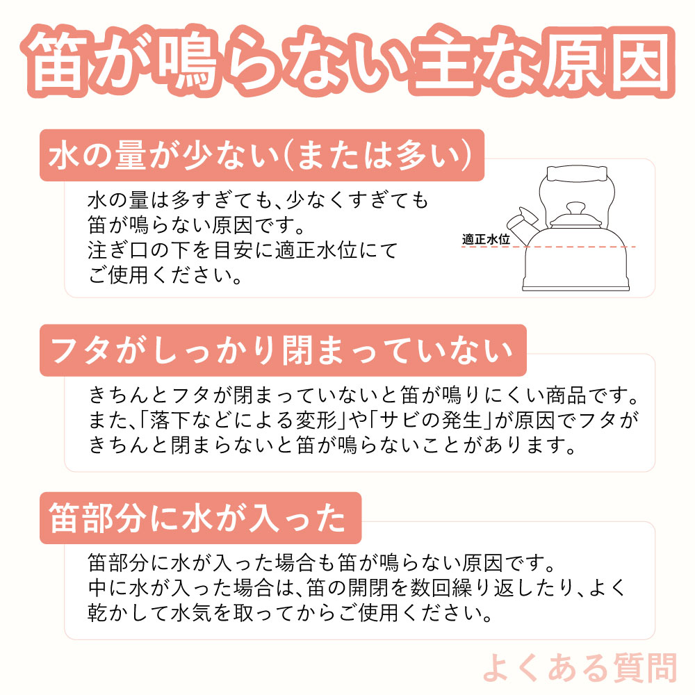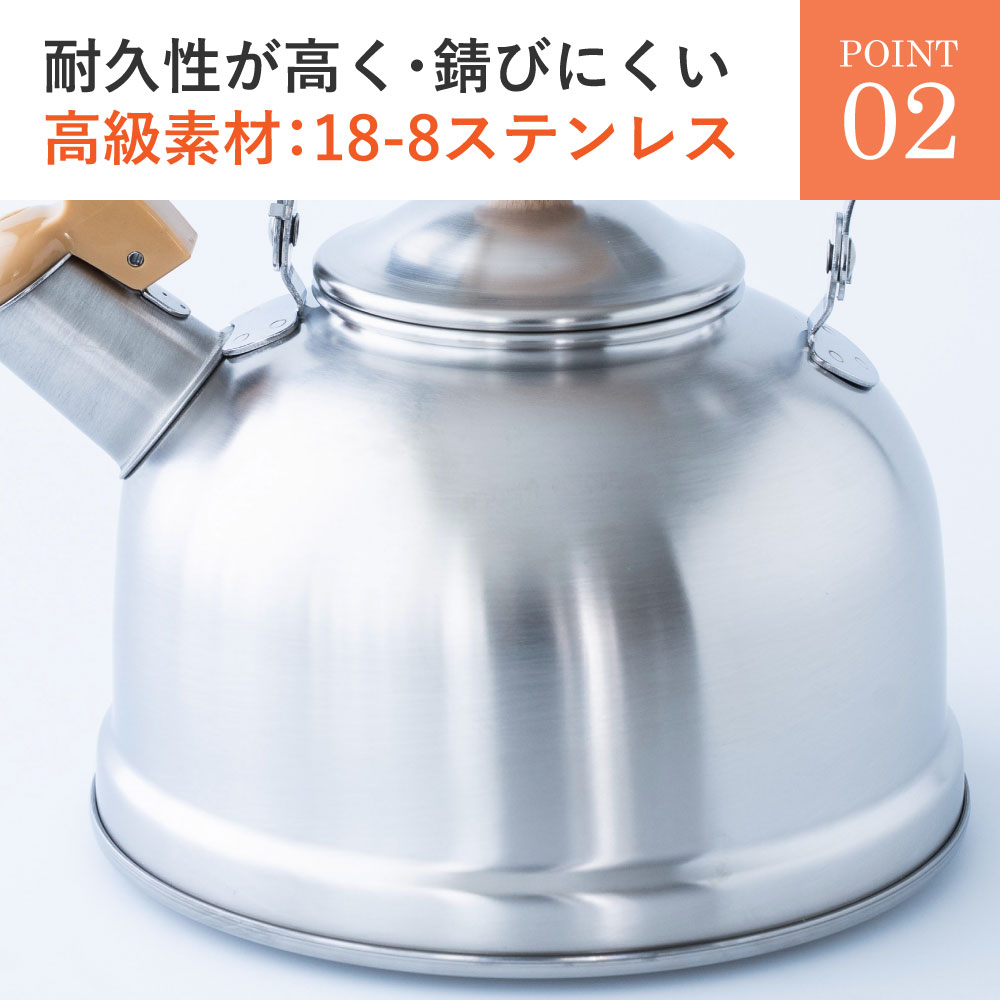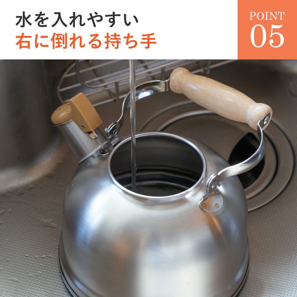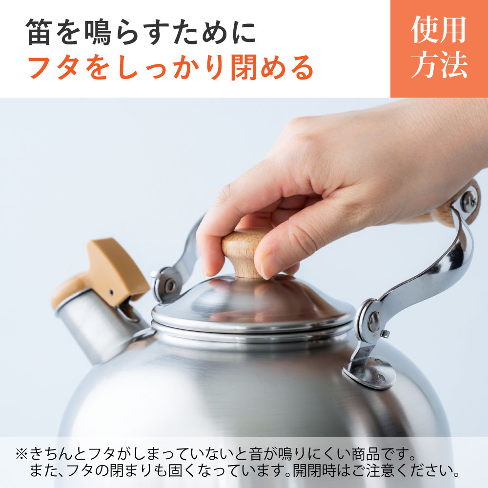 お湯が沸いたら耳に優しいハーモニカの音色で優しく教えてくれる笛吹ケトルです。毎日使うものだからこそ「可愛らしくシンプル」長く使っても飽きの来ないデザインです。金属加工が盛んな新潟県燕市で製造されたステンレス製で耐久性が高く、汚れが落ちやすくお手入れが簡単です。ガス火はもちろんIH調理器にも効率よく使えます。落ち着いた雰囲気のつや消し仕上げは傷が目立ちにくく、毎日使うのに飽きのこないデザインです。満水容量2.5/適正容量1.8Lです。※水の量が多すぎても少なすぎても音がならない場合がございます。注ぎ口の下のラインを目安に水を沸かしてください。※きちんとフタがしまっていないと音が鳴りにくい商品です。そのためフタの閉まりも固くなっています。開閉時はご注意ください。