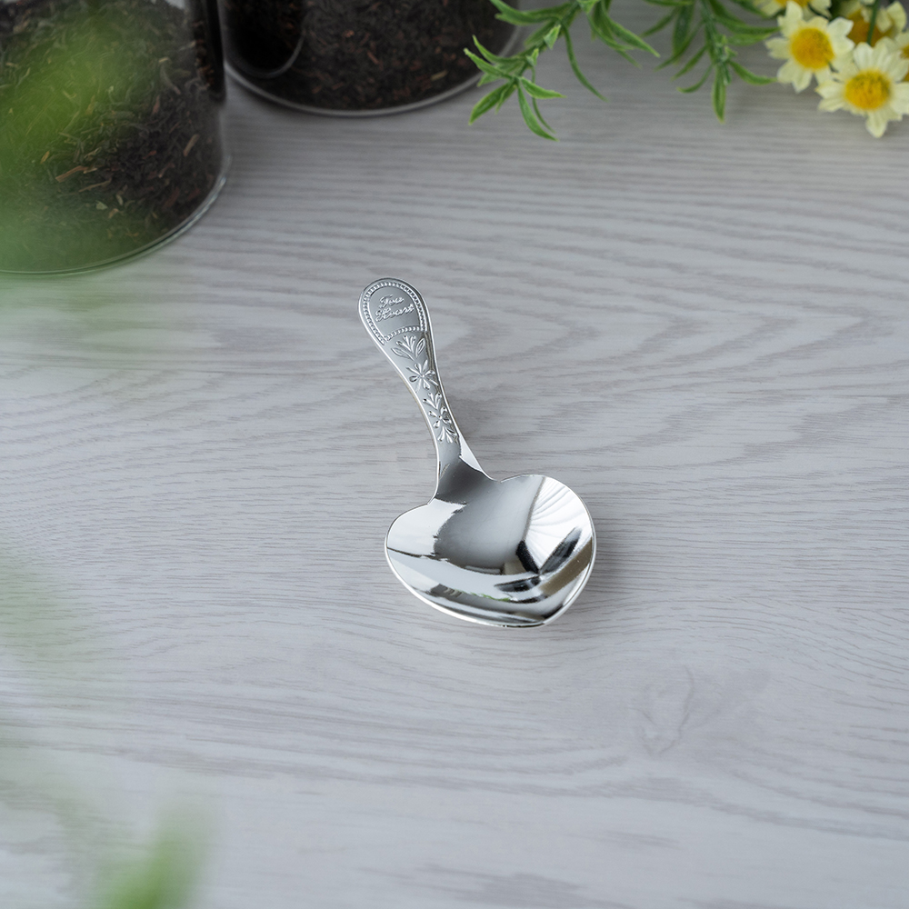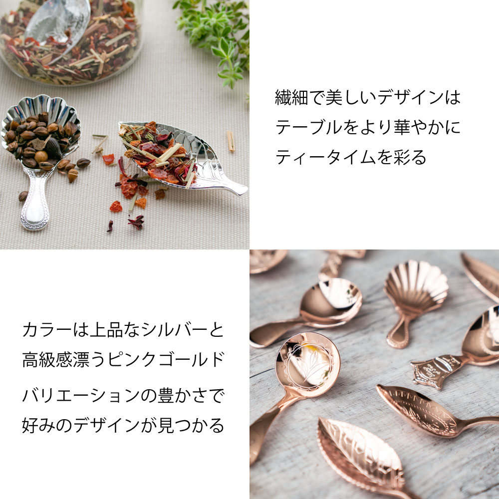 茶葉をすくうためのティーキャディースプーンです。ティーセットだけでなくこだわってお気に入りを選びたいアイテムです。シルバーメッキの上品な輝きとハンドル部の立体的なティーポットのデザインが印象的です。1さじでおおよそ4g程度の茶葉をすくうことができます。お茶好きな方へのちょっとしたプレゼントから、ウエディングギフトやお祝いにもおすすめです。※メッキ商品のため、食洗器やつけ置き洗いはご遠慮ください。