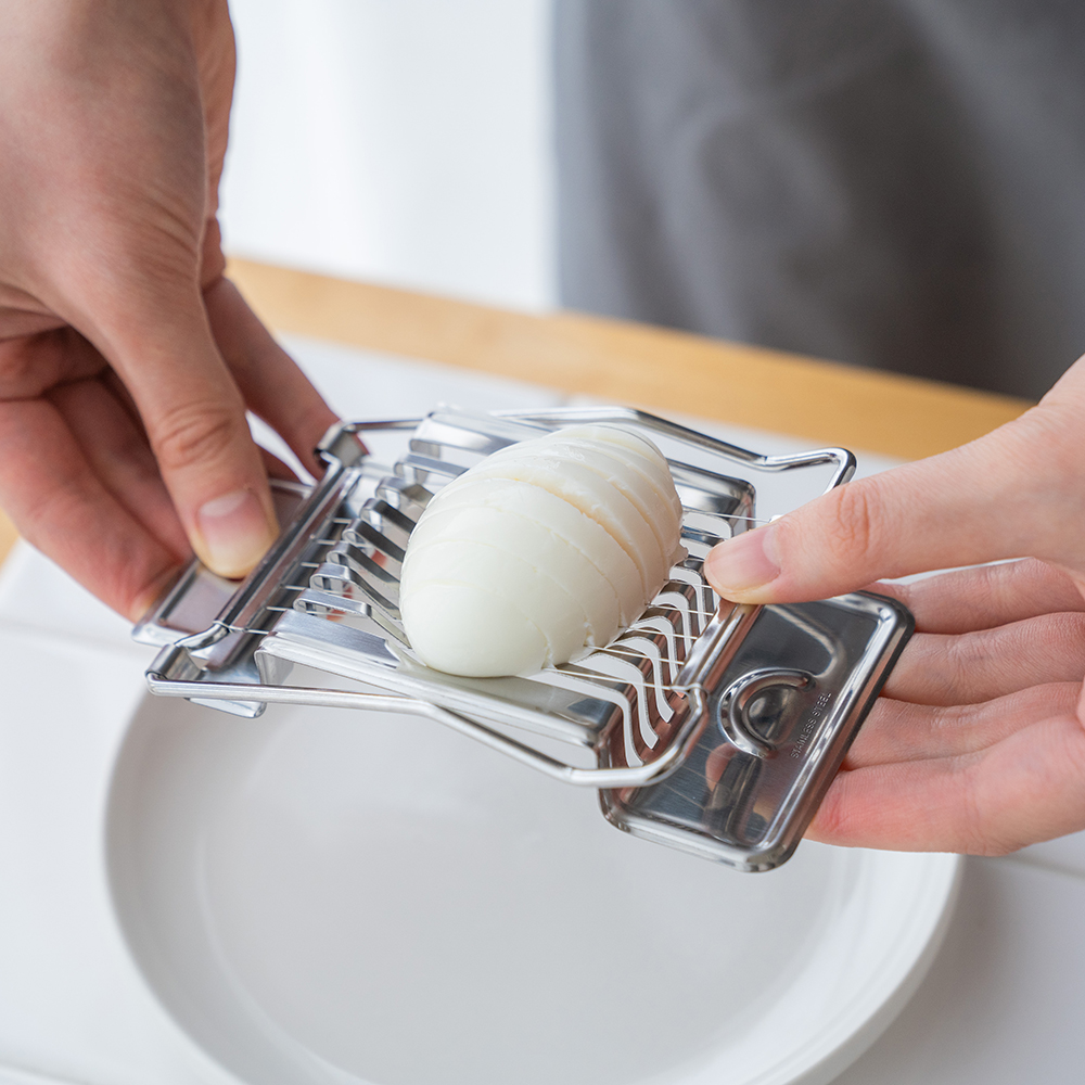 ゆで卵を置いてワイヤーを押し付けるだけ。身を崩さずにきれいにスライスできます。サラダなどのトッピングにも見た目が華やかです。