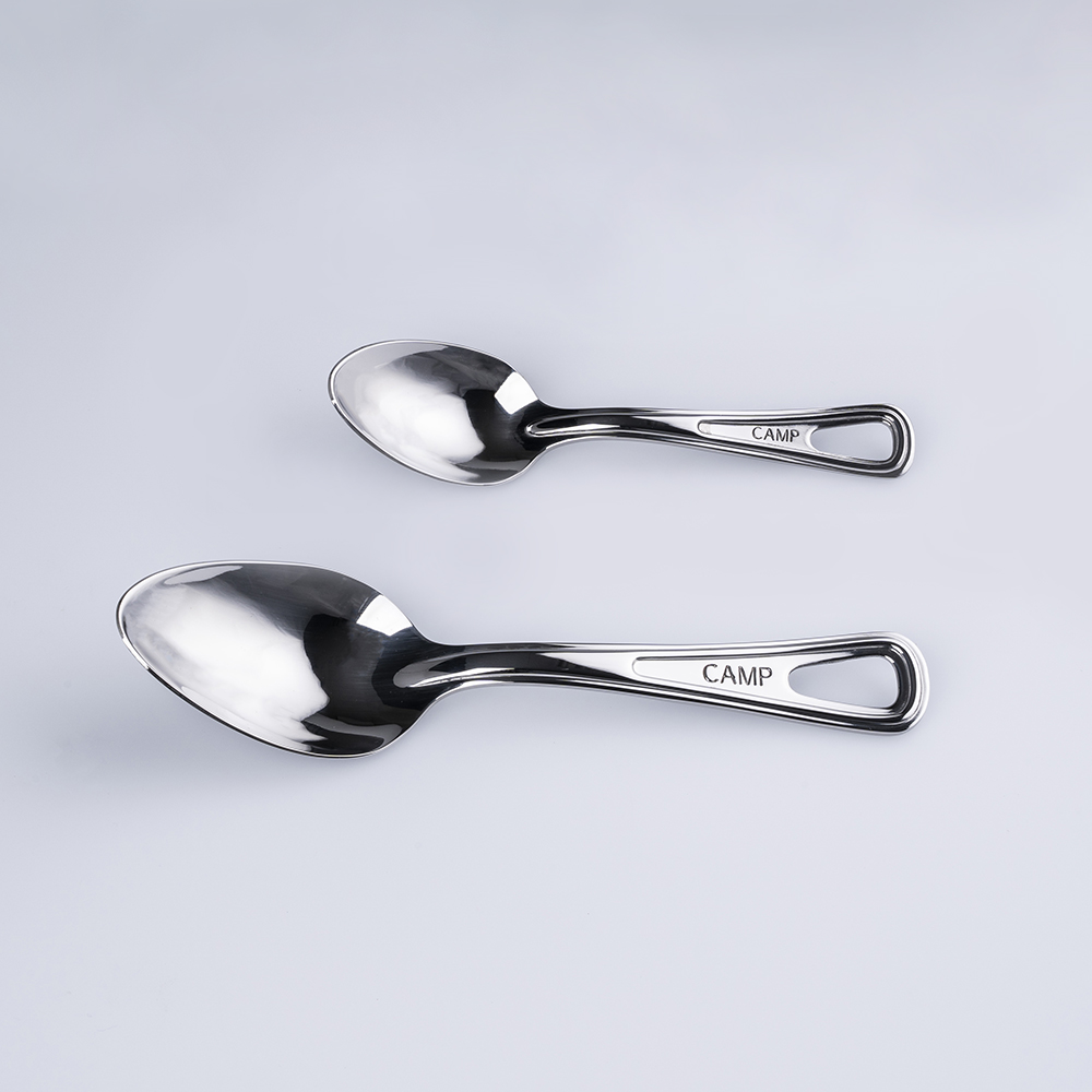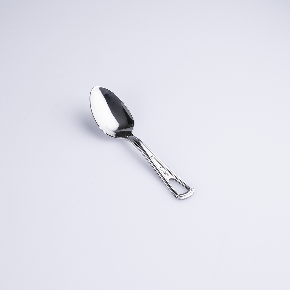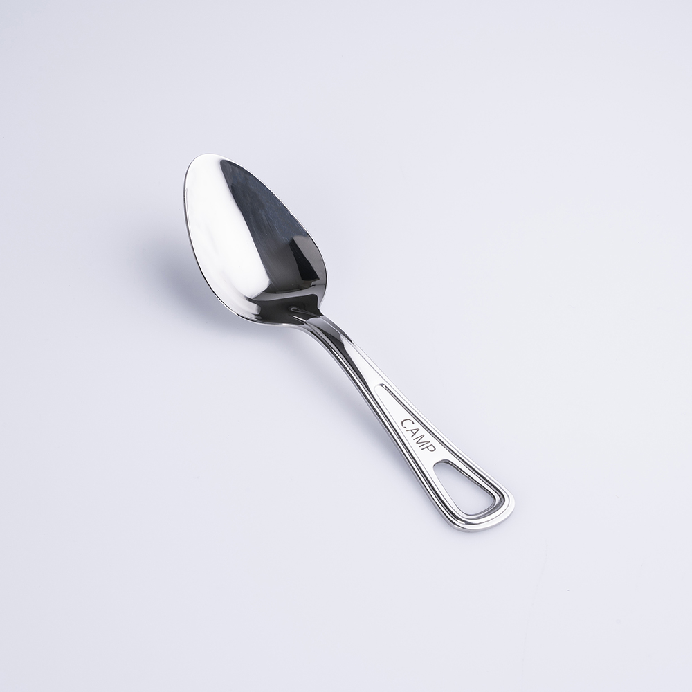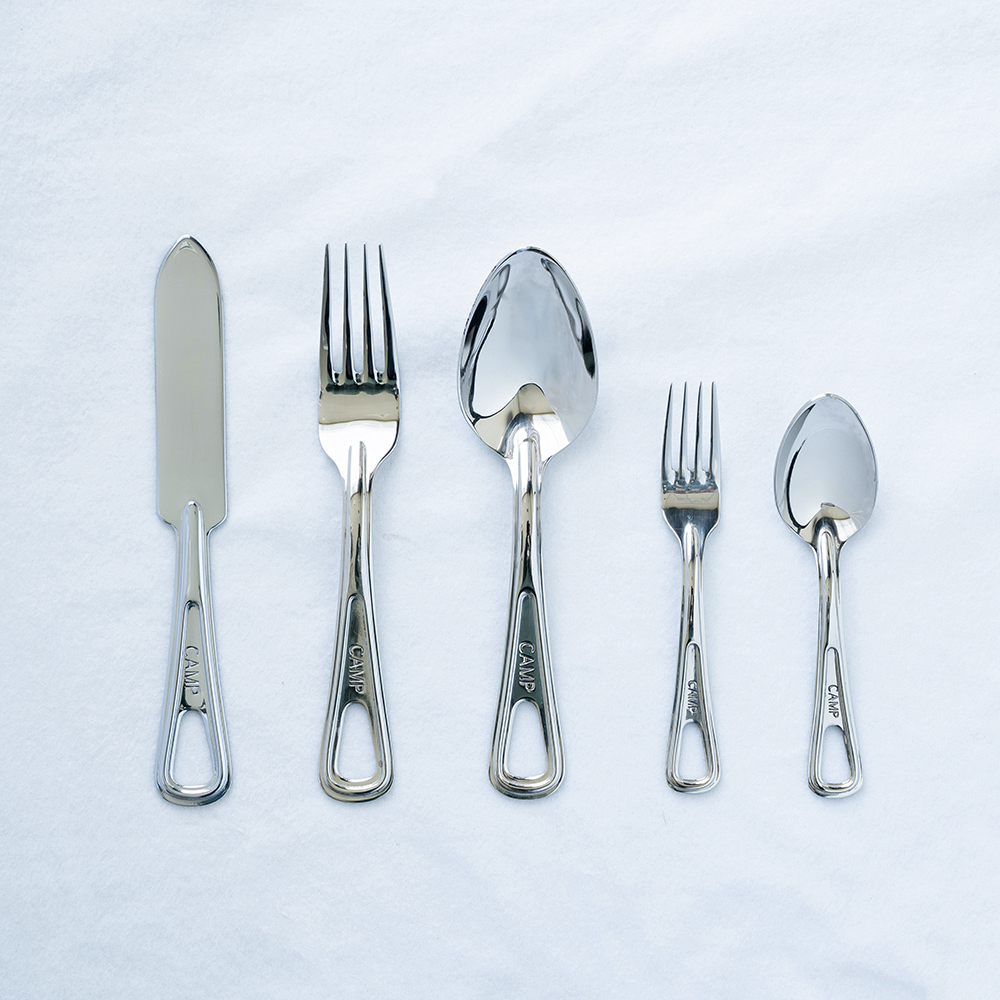 持ち手の部分には”CAMP”と文字が施され武骨なデザインが特徴のカトラリーシリーズ。米軍キャンプで使われいているスプーンやナイフ・フォークをオマージュ。ミリタリー感あふれる本品は、持ち手の穴の部分に紐を通してセットにしまとめておけるので、アウトドアやキャンプなどにうってつけです。