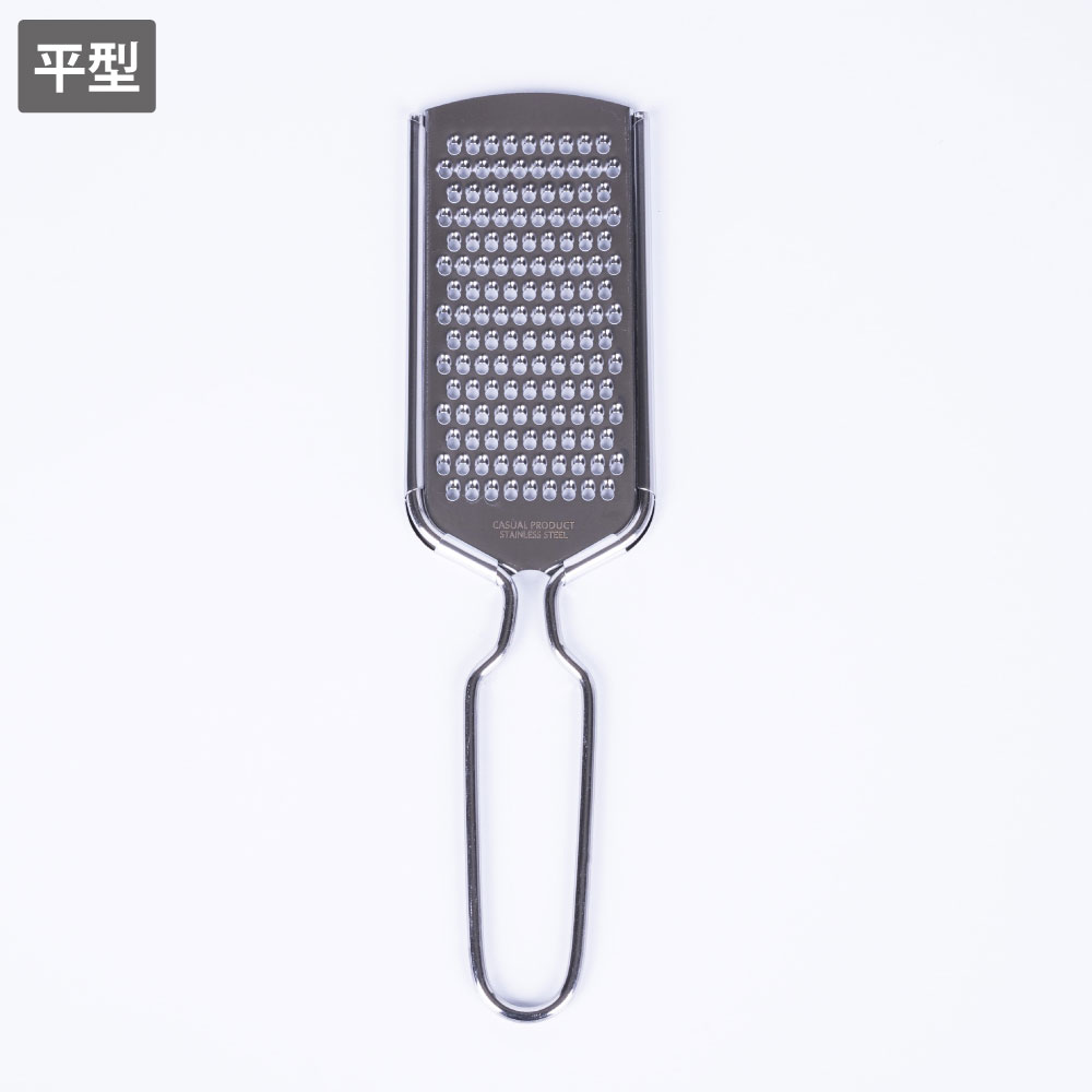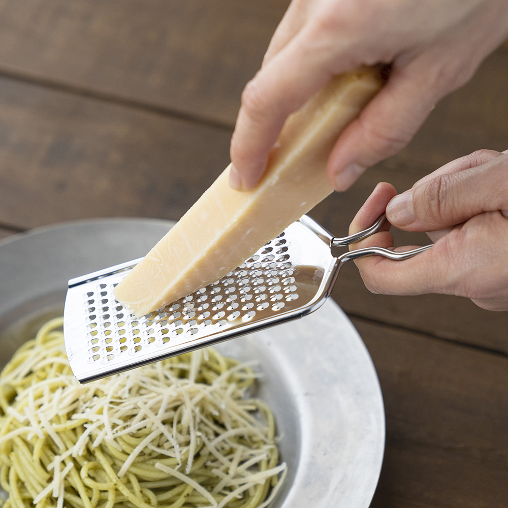ドームのような丸型と平型のシンプルな構造のチーズおろしです。サラダ、パスタ、ピザやグラタンのトッピングにハード系チーズを粉状にしてかける際に便利です。ハンドル部分をフックに吊り下げて収納できるので収納スペースをとらず、さっと取り出して手軽に使えます。ステンレス製のシンプルなデザインは耐久性とお手入れのしやすさに優れています。