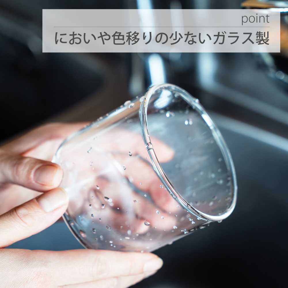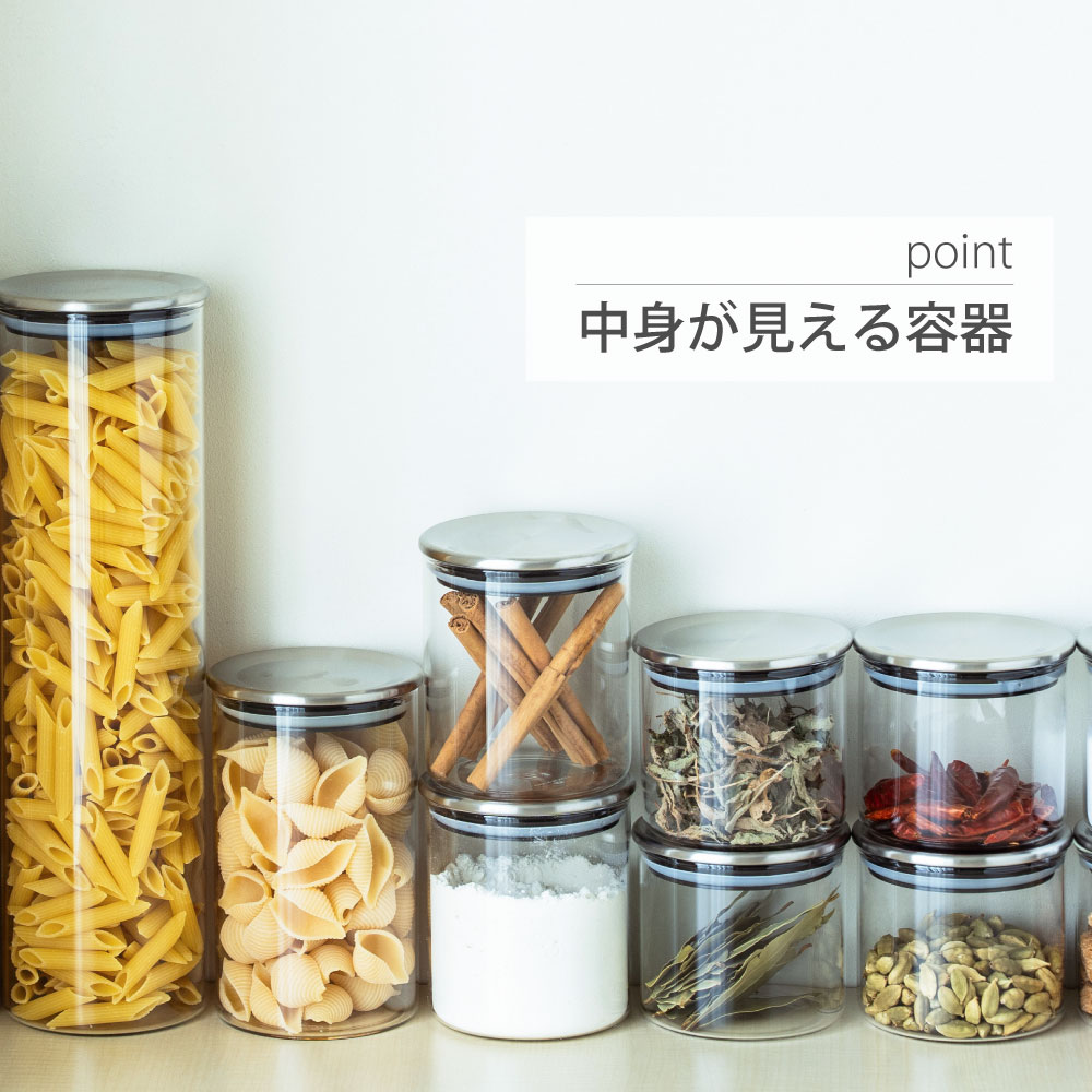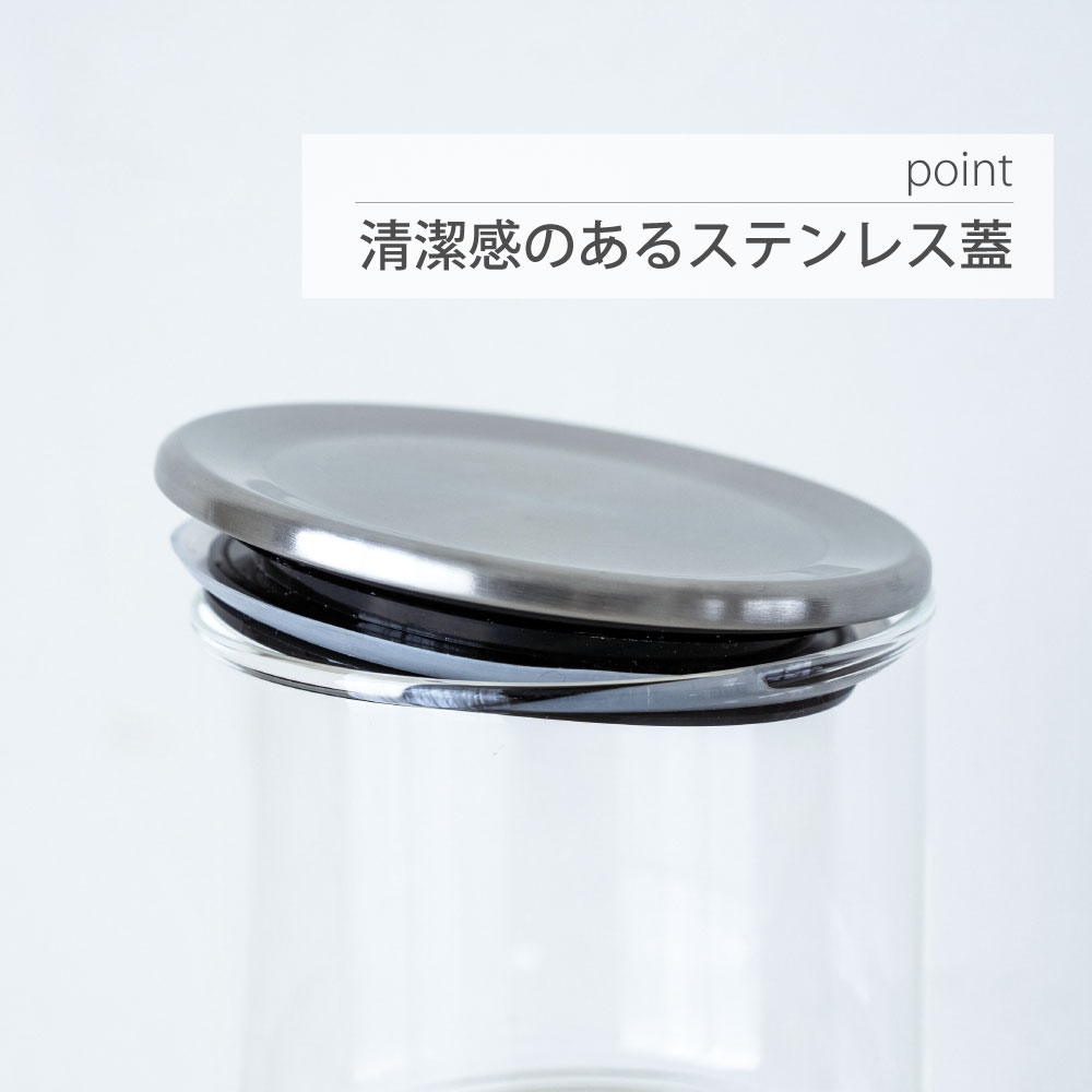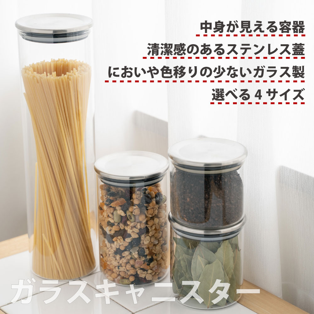 ステンレス製の蓋とガラスを組み合わせたスタイリッシュなキャニスターです。スッキリとしたシンプルなフォルムでいつものキッチンに馴染みます。蓋にはシリコン製のパッキンが付いているので、密閉性が高く、コーヒー豆や茶葉、お菓子そしてスパゲティーなどの保存に最適です。さらに、本体容器は耐熱ガラス製で熱湯消毒ができるので、いつまでも清潔にお使いいただけるのはもちろん、電子レンジ、食洗機も使用可能なので、作り置きの料理を温め直す際にも活躍する使用用途の広いキャニスターです。(電子レンジを使用の際は必ず蓋は外してください)サイズは、300ml、400ml、600mlとスパゲティージャーの4種類です。300ml、400ml、600mlのサイズにはスプーンが1つ付いています。同じサイズで揃えてみたり、用途に合わせていくつか組み合わせて“見せる収納”にするのも素敵です。※細かなスレやキズ等がある場合がございます。
