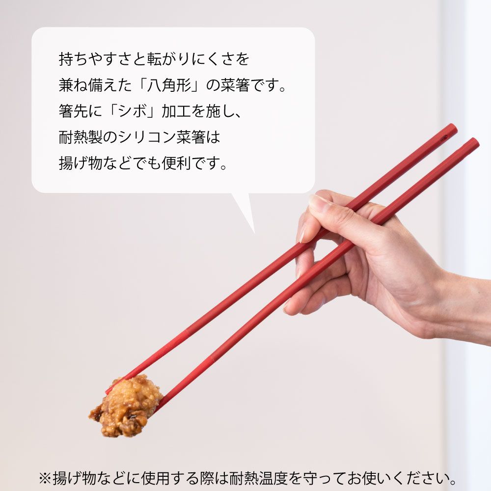先端にシリコーンゴムを使った菜箸です。フッ素樹脂加工をしたフライパンや鍋を傷つけることなく調理ができます。一般的に持ちやすく感じると言われる丸いお箸と転がりにくい四角形のお箸。二つの良いとこを併せ持った、四角形より角が取れて丸に近く転がりにくい「八角形」のデザインは持ちやすさと使いやすさを兼ね備えています。箸先のシリコーンゴムにすべり防止のために微細な凹凸の模様をつける「シボ加工」を施すことで、食材をしっかりつかむことができ、炒め物に揚げ物に万能にお使いいただけます。※揚げ物に使用の際は耐熱温度を守ってお使いください 【耐熱温度】シリコーンゴム(先端):220℃ / ナイロン:180℃