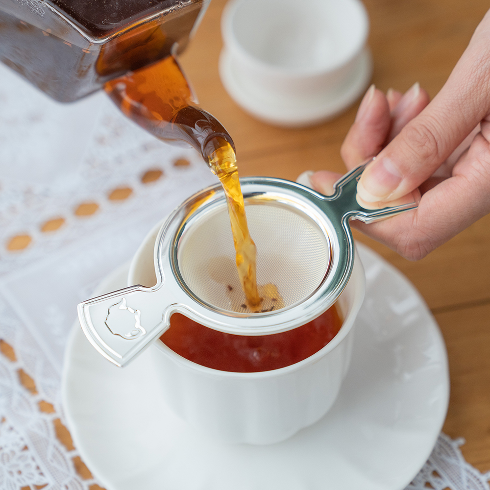 ステンレス製の細やかな網目が小さな茶葉もしっかり受け止めます。※メッキ加工品の食洗器使用、つけ置き洗いはご遠慮ください。