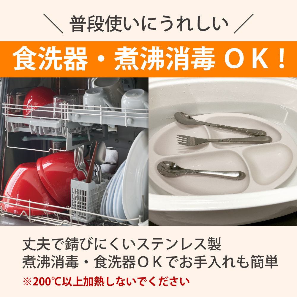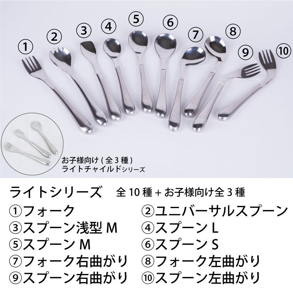 種類はヘッドサイズが異なる3種類のスプーン、先割れ型のユニバーサルスプーン、他、左曲がり、右曲がりタイプにフォークとご自身に合った商品をお選びいただけます。また、お子様向けのチャイルドシリーズもございます。